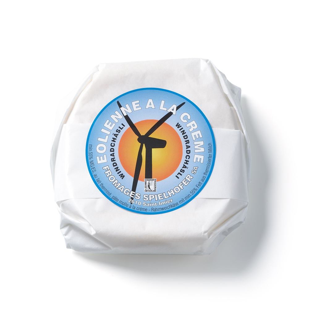 Der raffinierte Rahmweichkäse besticht durch seine köstliche Cremigkeit. Joseph Spielhofer hat diesen Käse kreiert, als der Windpark auf dem Mont Crosin eröffnet wurde. Damals führte er noch die Käserei in Cormoret und die Eolienne war sein erster Weichkäse. Die Referenz an die Windräder ist kein Zufall: Fromages Spielhofer legte schon damals nicht nur Wert auf eine handwerkliche und naturnahe Produktion, sondern auch auf Nachhaltigkeit.